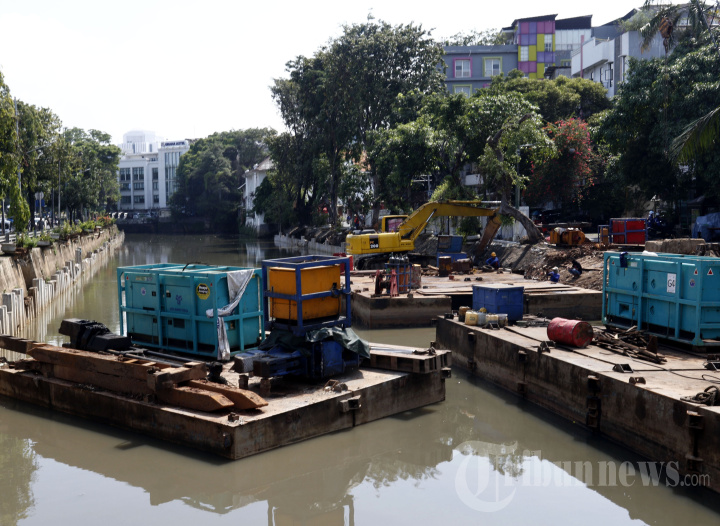 Pekerja dengan menggunakan alat berat tengah melakukan pembangunan turap pada Anak Kali Ciliwung di kawasan Pasar Baru, Jakarta Pusat, Senin (4/4/2022). Pembangunan turap tersebut sebagai upaya Pemprov DKI Jakarta untuk mencegah banjir di Ibu Kota. WARTA KOTA/YULIANTO