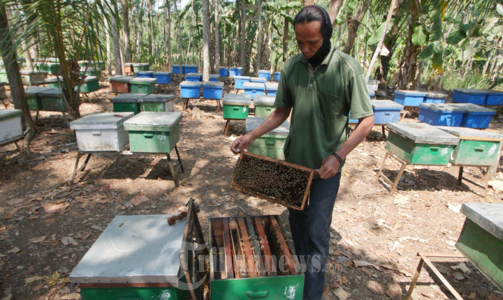 TRIBUNNEWS.COM, SEMARANG - Sejumlah petani mitra binaan PT Jamkrindo yang memproduksi madu, beraktivitas di lokasi budi daya lebah di Tuntang, Kabupaten Semarang, Jawa Tengah, Selasa (29/8/2023). Mereka memanfaatkan program pemberdayaan Jamkrindo melalui pendanaan usaha mikro dan kecil,(PUMK) untuk mengembangkan skala bisnis. //HO