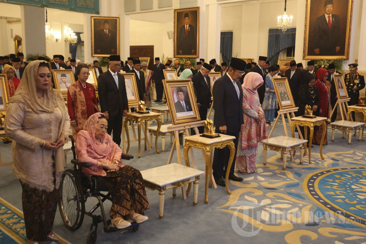 ANUGERAH PAHLAWAN NASIONAL - Istri almarhum K.H. Abdurrahman Wahid, Sinta Nuriyah dan anaknya Yenny Wahid, anak Jenderal Besar TNI Soeharto, Siti Hardijanti Rukmana dan Bambang Trihatmodjo serta para keluarga penerima anugerah pahlawan nasional menghadiri acara penganugerahan gelar pahlawan nasional di Istana Negara, Jakarta, Senin (10/11/2025). Presiden Prabowo Subianto menganugerahkan pahlawan nasional kepada 10 tokoh di antaranya K.H. Abdurrahman Wahid, Jenderal Besar TNI Soeharto, dan aktivis buruh Marsinah sebagai upaya pemerintah dalam menghormati jasa para pendahulu dan pemimpin bangsa yang dinilai telah memberikan kontribusi besar bagi negara. Tribunnews/Jeprima
