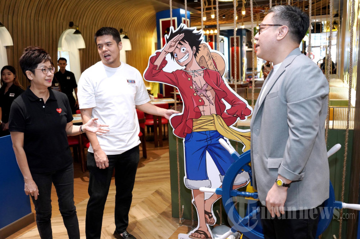 Chief Commercial Officer PT Lippo Malls Indonesia Rita Yovita (kiri) berbincang dengan Direktur One Piece Cafe Indonesia Franseda Natalio (tengah) dan Mall Direktur Senayan Park Josef Lumbantobing (kanan) saat pembukaan One Piece Cafe Indonesia di Senayan Park, Jakarta, Sabtu (23/11/2024). Senayan Park, pusat perbelanjaan yang berlokasi di jantung kota Jakarta, menjadi tuan rumah dari flagship pertama di Asia, One Piece Caf? Indonesia yang berasal dari pusat ekspansi IP (Intellectual Property) TOEI Animation yang memproduksi berbagai animasi populer, dan One Piece menjadi salah satu yang terkenal di seluruh dunia yang ditujukan sebagai bentuk dukungan komunitas dan penggemar One Piece yang terkenal dengan sebutan Nakama yang cukup kuat di Indonesia. One Piece dipastikan akan menghadirkan pengalaman tematik yang imersif bagi para penggemar, dengan menghidupkan dunia One Piece dengan sajian kuliner eksklusif serta atmosfer yang menggambarkan karakter dan cerita ikonik dari serial animasi yang cukup populer. TRIBUNNEWS/IRWAN RISMAWAN