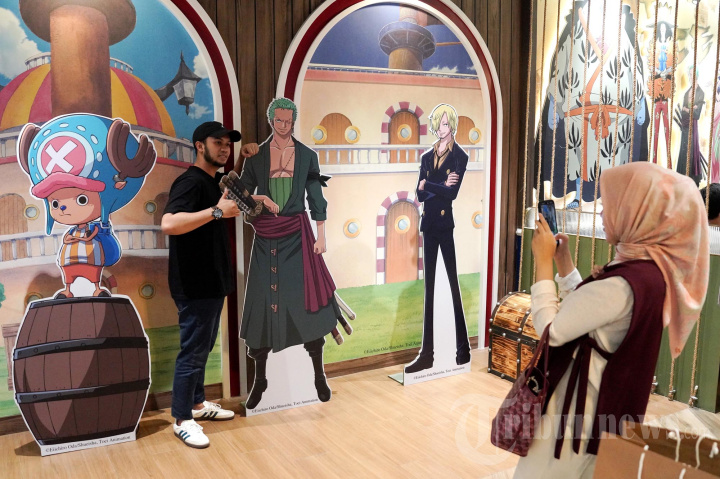 Pengunjung berfoto saat pembukaan One Piece Cafe Indonesia di Senayan Park, Jakarta, Sabtu (23/11/2024). Senayan Park, pusat perbelanjaan yang berlokasi di jantung kota Jakarta, menjadi tuan rumah dari flagship pertama di Asia, One Piece Caf? Indonesia yang berasal dari pusat ekspansi IP (Intellectual Property) TOEI Animation yang memproduksi berbagai animasi populer, dan One Piece menjadi salah satu yang terkenal di seluruh dunia yang ditujukan sebagai bentuk dukungan komunitas dan penggemar One Piece yang terkenal dengan sebutan Nakama yang cukup kuat di Indonesia. One Piece dipastikan akan menghadirkan pengalaman tematik yang imersif bagi para penggemar, dengan menghidupkan dunia One Piece dengan sajian kuliner eksklusif serta atmosfer yang menggambarkan karakter dan cerita ikonik dari serial animasi yang cukup populer. TRIBUNNEWS/IRWAN RISMAWAN
