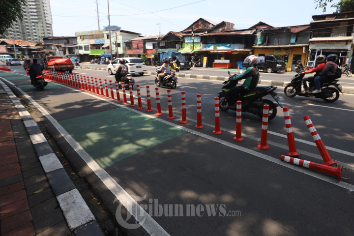 Sejumlah pengendara sepeda motor saat melintas disamping jalur sepeda di Jakarta, Selasa (29/11/2022). Kepala Dinas Perhubungan (Dishub) DKI Jakarta, Syafrin Liputo memastikan bahwa tidak akan ada pemberhentian untuk jalur sepeda serta pemprov DKI Jakarta telah menyiapkan anggaran sebesar Rp 7,5 miliar. Di mana pemanfaatannya tergantung dari hasil evaluasi. Tribunnews/Jeprima