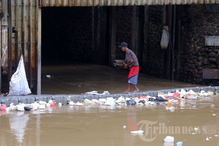 Seorang pemulung sedang mengumpulkan barang-barang yang bisa dimanfaatkan kembali di Pintu Air Manggarai, Jakarta Selatan, Selasa (15/3/2022). Tingginya air Sungai Ciliwung memudahkan para pemulung mencari barang-barang yang masih bisa mereka manfaatkan. Warta Kota/Henry Lopulalan