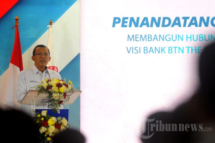 Direktur Utama Bank BTN Haru Koesmahargyo memberikan kata sambutan sebelum penandatanganan Perjanjian Kerja Bersama (PKB) Tahun 2022 di Jakarta, Kamis (18/8). Menaker mengapresiasi atas proses yang cepat dalam PKB tersebut yang disepkati antara pihak manajemen BTN dengan SP. Dengan penandatangan PKB tersebut, diharapkan dapat menciptakan kolaborasi yang positif guna mewujudkan visi Bank BTN menjadi The Best Mortgage Bank In Southeast Asia Pada Tahun 2025. Tribunnews/Jeprima