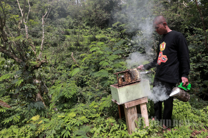 Petani mengambil sarang madu yang dihasilkan lebah madu (Apis Cerana) saat panen di Penangkaran Lebah Madu Takoma, Simalungun, Sumatera Utara, Minggu (12/12/2021). Penangkaran lebah madu Takoma yang juga berkonsep edukasi wisata tersebut memasarkan madu dengan harga Rp 200 ribu per kilogram. TRIBUNNEWS/IRWAN RISMAWAN