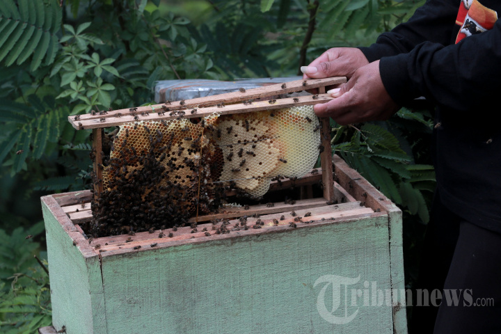 Petani mengambil sarang madu yang dihasilkan lebah madu (Apis Cerana) saat panen di Penangkaran Lebah Madu Takoma, Simalungun, Sumatera Utara, Minggu (12/12/2021). Penangkaran lebah madu Takoma yang juga berkonsep edukasi wisata tersebut memasarkan madu dengan harga Rp 200 ribu per kilogram. TRIBUNNEWS/IRWAN RISMAWAN