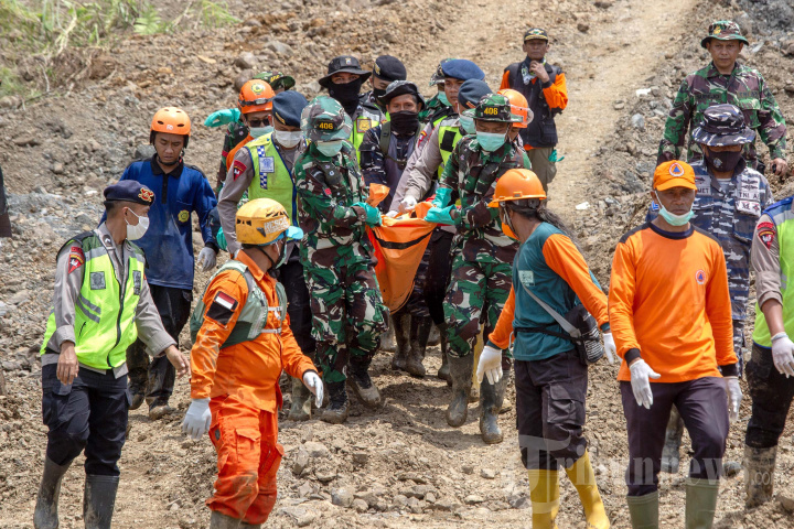 PENCARIAN KORBAN - Tim penyelamat mengevakuasi jenazah setelah tanah longsor melanda permukiman di Desa Pandanarum, Jawa Tengah, Indonesia, 20 November 2025. Setidaknya 10 orang tewas dan 18 lainnya masih hilang setelah tanah longsor melanda permukiman di Provinsi Jawa Tengah, Indonesia, kata pihak berwenang pada hari Jumat. (Photo by Joni Amarta/Xinhua)