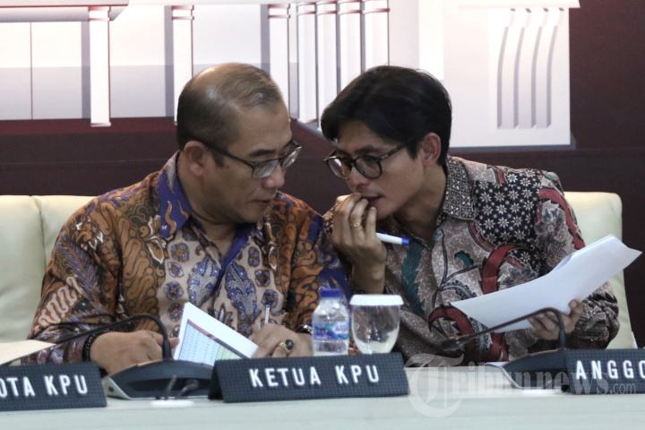 Ketua KPU Hasyim Asy'ari (kiri) didampingi August Mellaz (kanan) memberikan keterangan saat penetapan dan pengumuman Daftar Calon Sementara (DCS) Pemilu 2024 di Gedung KPU Pusat, Jakarta, Jumat (18/8/2023). Komisi Pemilihan Umum (KPU) menetapkan 9.925 orang sebagai calon anggota Dewan Perwakilan Rakyat (DPR) dalam daftar calon sementara (DCS) Pemilu 2024. TRIBUNNEWS/IRWAN RISMAWAN