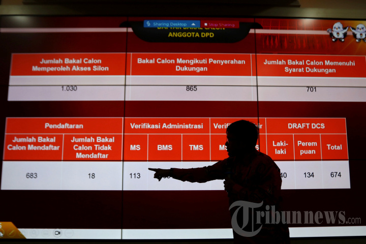 Siluet Komisioner KPU Idham Holik menunjukkan data saat penetapan dan pengumuman Daftar Calon Sementara (DCS) Pemilu 2024 di Gedung KPU Pusat, Jakarta, Jumat (18/8/2023). Komisi Pemilihan Umum (KPU) menetapkan 9.925 orang sebagai calon anggota Dewan Perwakilan Rakyat (DPR) dalam daftar calon sementara (DCS) Pemilu 2024. TRIBUNNEWS/IRWAN RISMAWAN
