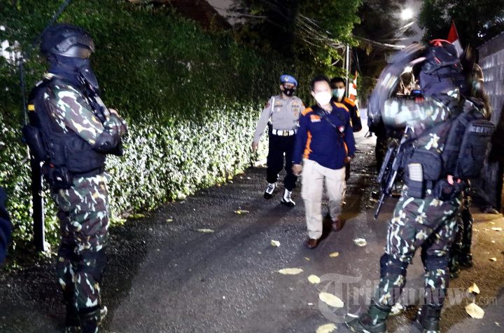 Akses menuju rumah pribadi mertuanya Irjen Pol Ferdy Sambo di Jalan Kemang XI A, Mampang Prapatan, Jakarta Selatan, Selasa (9/8/2022). Dijaga ketat anggota Korps Brimob dari satuan Brimob berseragam loreng dengan senjata lengkap terpantau turun dari kendaraan taktis dan bersiaga di lokasi. Penyidik dari Kepolisian telah melakukan penyitaan terhadap beberapa barang milik Irjen Pol Ferdy Sambo. (Warta Kota/YULIANTO)