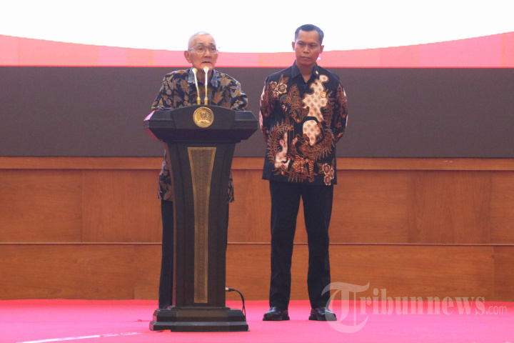 Mantan Wakil Presiden ke-6 Try Sutrisno memberikan sambutan pada acara penyerahan berkas penyampaian aspirasi kepada Dewan Presidium di Gedung Nusantara IV DPR RI, Senayan, Jakarta Pusat, Jumat (10/11/2023). Penyampaian Aspirasi kepada Dewan Presidium dalam rangka mengembalikan Konstitusi ke UUD 1945 sebelum amandemen dan mendesak kepada MPR RI untuk segera menggelar Sidang MPR dengan agenda tunggal, yaitu untuk mengembalikan sistem bernegara sesuai rumusan pendiri bangsa melalui penetapan kembali Undang-Undang Dasar 1945 yang berlaku sebelum Perubahan di tahun 1999 hingga 2002. Warta Kota/Yulianto