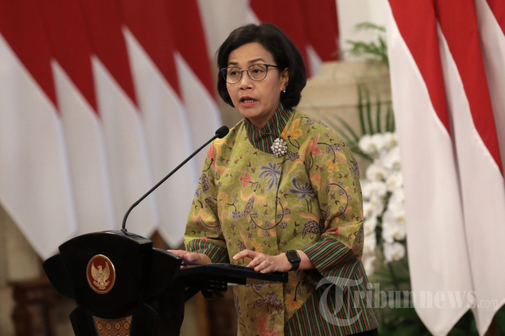 Menteri Keuangan Sri Mulyani memberikan laporan sebelum penyerahan digital Daftar Isian Pelaksanaan Anggaran (DIPA) dan Buku Daftar Alokasi Transfer ke Daerah Tahun Anggaran 2024 di Istana Negara, Jakarta, Rabu (29/11/2023). Presiden Jokowi menyerahkan secara digital DIPA dan Buku Daftar Alokasi Transfer ke Daerah tahun 2024 kepada para menteri, kepala lembaga, serta kepala daerah. TRIBUNNEWS/IRWAN RISMAWAN