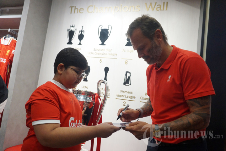 Mantan pemain Liverpool FC Patrik Berger menandatangani buku seorang anak saat peresmian toko Liverpool FC di Pondok Indah Mall, Jakarta, Sabtu (21/7/2024). Kanmo Group perusahaan ritel asal Indonesia bersama Weston Corp dengan meresmikan toko Liverpool FC pertama di Indonesia dengan menghadirkan mantan pemain di klub sepak bola Liverpool FC Patrik Berger yang diharapkan dengan dibukanya toko Liverpool FC ini, penggemar Liverpool FC kini dapat dengan mudah mendapatkan produk-produk asli dari klub kebanggaan mereka secara langsung. TRIBUNNEWS/IRWAN RISMAWAN