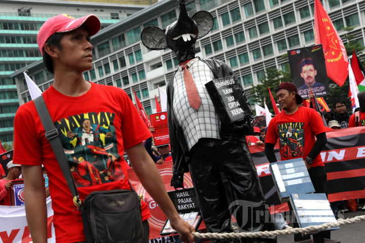Sejumlah buruh dari berbagai aliansi melakukan aksi memperingati Hari Buruh Internasional di Kawasan Bundaran HI, Jakarta, Rabu (1/5/2024). Dalam aksinya mereka meminta pemerintah untuk meningkatkan kesejahteraan para buruh. TRIBUNNEWS/IRWAN RISMAWAN