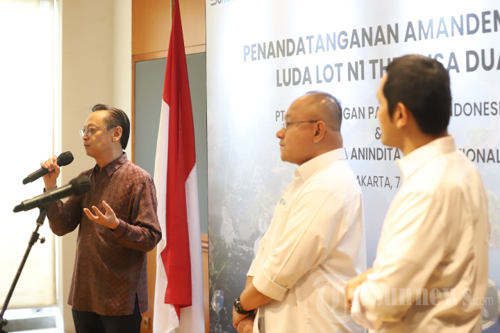 Direktur Komersial PT Pengembangan Pariwisata Indonesia atau ITDC Troy Warokka (tengah) bersama Presiden Direktur PT Suryalaya Anindita International (SAI) Johannes Suriadjaja (kiri) memberikan keterangan pers usai menandatangani perpanjangan kerjasama Land Utilization & Land Development Agreement (LUDA) untuk Lot N1 di kawasan The Nusa Dua Bali di Jakarta, Selasa, (07/01/2025). Perpanjangan kerjasama ini diharapkan dapat mendukung peningkatan kualitas layanan dan fasilitas di Paradisus by Meliá Bali, sehingga mampu menarik lebih banyak wisatawan, baik dari dalam negeri maupun mancanegara. Upaya ini juga diharapkan dapat memperkuat posisi kawasan The Nusa Dua sebagai destinasi wisata unggulan yang menawarkan pengalaman akomodasi berkelas dunia. Tribunnews/Jeprima