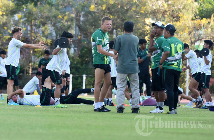 PERKUAT FISIK - Dengan arahan pelatih Persebaya Josep Gombau, para pemain persebaya kembali berlatih di Lapangan Thor Surabaya, Selasa (26/9/2023). Latihan kali ini para pemain dilatih untuk memperkuat fisik dan rintangan, diantaranya dengan disiapkannya barbel di lapangan tempat latihan. SURYA/HABIBUR ROHMAN