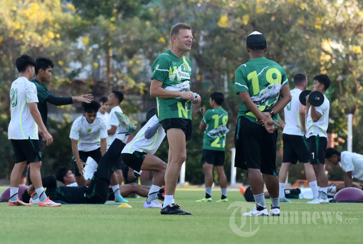 PERKUAT FISIK - Dengan arahan pelatih Persebaya Josep Gombau, para pemain persebaya kembali berlatih di Lapangan Thor Surabaya, Selasa (26/9/2023). Latihan kali ini para pemain dilatih untuk memperkuat fisik dan rintangan, diantaranya dengan disiapkannya barbel di lapangan tempat latihan.