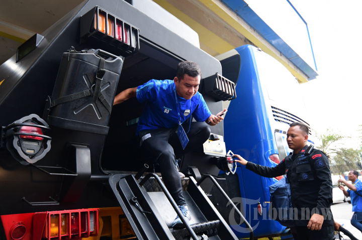 SURYAMALANG, MALANG- Pesepakbola Persib Bandung Erwin Ramdani saat tiba di Stadion Kanjuruhan Kabupaten Malang menggunakan kendaraan taktis (rantis) Baraccuda milik Polda Jatim saat akan melawan Arema FC dalam laga lanjutan Liga 1 2022, Minggu (11/9/2022). Para Pemain dan Official Persib Bandung dikawal ketat petugas saat akan menjamu Arema FC dalam laga lanjutan Liga 1 2022. SURYA/PURWANTO