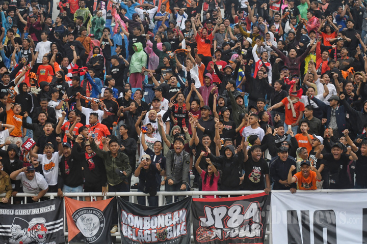 KALAHKAN AREMA - Suporter tim Persija Jakarta, The Jak Mania memberikan dukungan kepada timnya saat laga lanjutan Super League 2025-2026 antara Arema FC VS Persija Jakarta di Stadion Kanjuruhan, Kabupaten Malang, Jawa Timur, Sabtu (8/11/2025). Arema FC kalah dengan tim tamu Persija Jakarta dengan skor 1-2. SURYA/PURWANTO