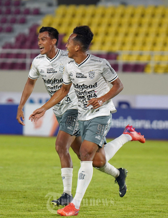 Ekspresi pesepak bola Bali United, M Rahmat (kanan) setelah mencetak gol pada laga Persita Tangerang vs Bali United dalam lanjutan BRI Liga 1 2022/2023 di Stadion Manahan, Solo, Senin (5/12/2022) malam. TRIBUNNEWS/Muhammad Nursina