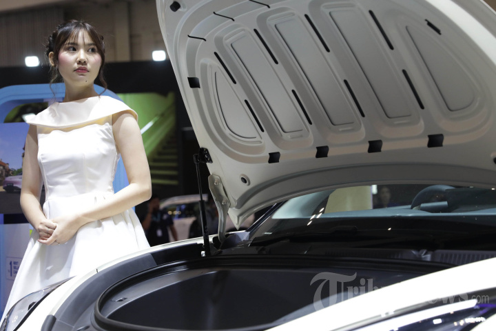 GJAW 2025 - Sales Promotion Girl berdiri di dekat mobil yang dipamerkan pada pameran otomotif Gaikindo Jakarta Auto Week (GJAW) 2025 di ICE BSD, Tangerang, Jumat (21/11/2025). Kehadiran SPG tersebut bertugas untuk memandu pengunjung yang tertarik membeli kendaraan yang dipamerkan. TRIBUNNEWS/IRWAN RISMAWAN