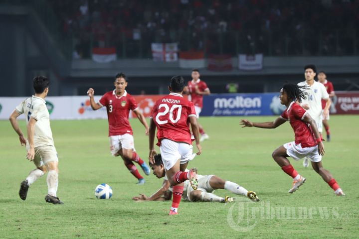 Ketiga pemain Timnas Indonesia U-19 Razzaa Fachrezi Aziz, Ronaldo Joybera R Junior Kwateh dan Dimas Juliono Pamungkas mencoba merebut bola dari para pemain Timnas Thailand U-19 pada laga ketiga babak penyisihan Piala AFF U-19 di Stadion Patriot Candrabhaga, Bekasi, Rabu (6/7/2022). Hingga wasit meniup peluit panjang Indonesia harus menerima hasil imbang 0-0 dari Thailand. Tribunnews/Jeprima