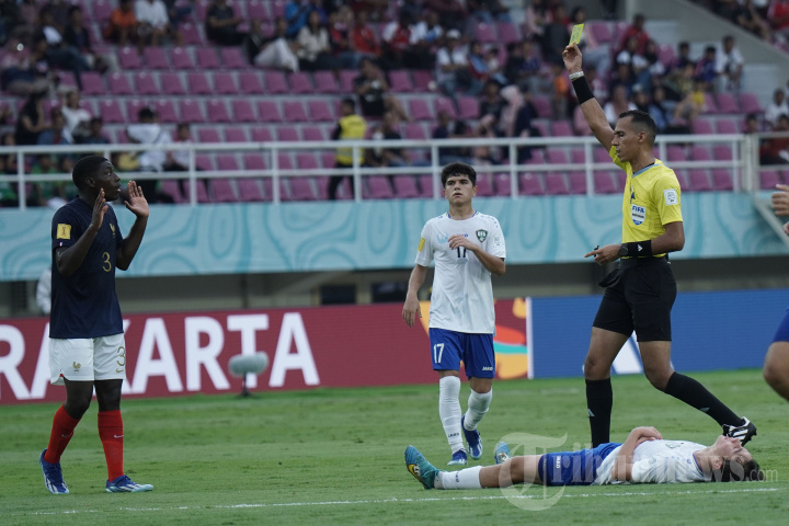 Pesepak bola Prancis, Nhoa Ryan Sangui (kiri) menerima kartu kuning dalam pertandingan Prancis vs Uzbekistan babak 8 besar Piala Dunia U17 2023 di Stadion Manahan, Solo, Sabtu (25/11/2023). Babak pertama kedua tim selesai dengan skor sama kuat 1-1. Tribun Solo/Muhammad Nursina
