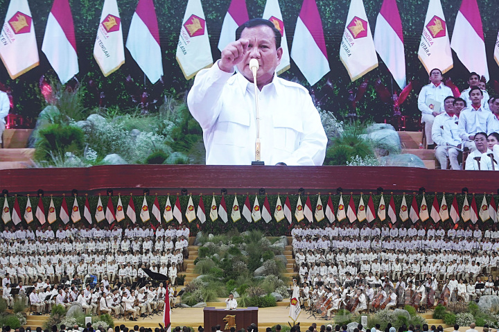 Ketua Umum dan Ketua Pembina Partai Gerindra sekaligus Presiden terpilih Prabowo Subianto menyampaikan pidato politiknya saat penutupan Rapimnas Gerindra di Indonesia Arena, Senayan, Jakarta Pusat, Sabtu (31/8/2024). Rapimnas dihadiri oleh Presiden dan Wakil Presiden Joko Widodo dan Maruf Amin serta para pimpinan elite pertai politik. Tribunnews/Jeprima