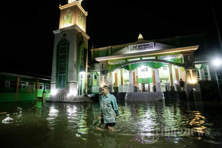 Seorang pria menerobos banjir di luar masjid menyusul hujan deras di Semarang, Jawa Tengah, pada 15 Maret 2024. (Photo by DEVI RAHMAN / AFP)