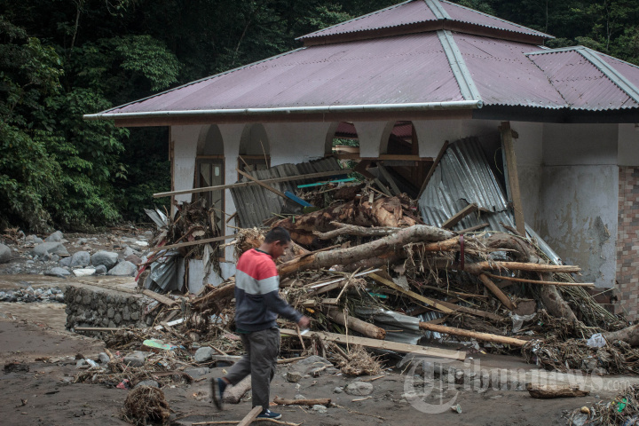 Masjid yang rusak akibat puing-puing terlihat pasca banjir bandang dan aliran lahar dingin dari gunung berapi di Tanah Datar, Sumatera Barat, pada 12 Mei 2024. - Sedikitnya 34 orang tewas dan 16 lainnya hilang pasca banjir bandang dan aliran lahar dingin dari gunung berapi melanda Indonesia bagian barat, kata pejabat bencana setempat pada 12 Mei. (Photo by REZAN SOLEH / AFP)