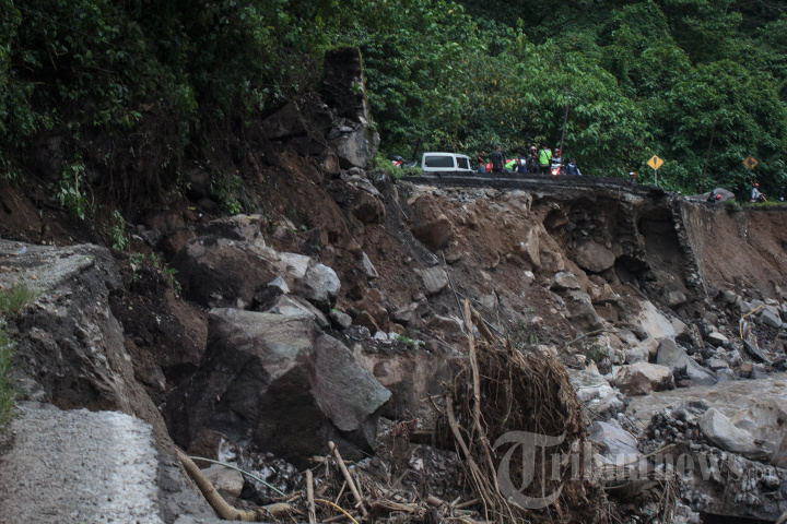 Jalan rusak terlihat pasca banjir bandang dan aliran lahar dingin gunung berapi di Tanah Datar, Sumatera Barat, pada 12 Mei 2024. - Sedikitnya 34 orang tewas dan 16 lainnya hilang pasca banjir bandang dan aliran lahar dingin gunung berapi melanda Indonesia bagian barat, kata seorang pejabat bencana setempat pada 12 Mei. (Photo by REZAN SOLEH / AFP)