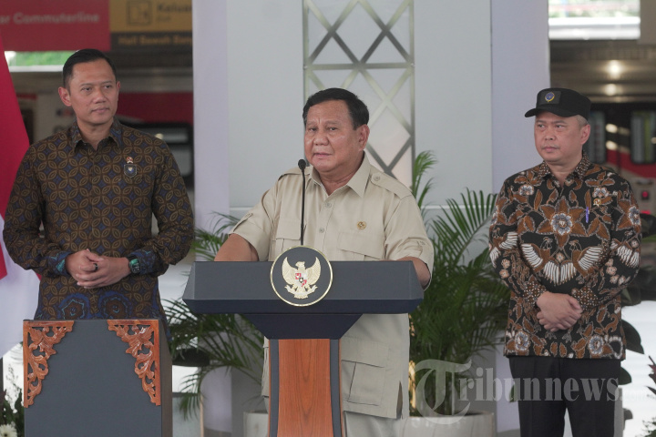 PERESMIAN STASIUN TANAH ABANG BARU - Presiden Prabowo Subianto memberikan kata sambutan pada acara peresmian Stasiun Tanah Abang baru didampingi Menteri Koordinator Infrastruktur dan Pembangunan Kewilayahan Agus Harimurti Yudhoyono, Menteri Perhubungan Dudy Purwagandhi di Jakarta Pusat, Selasa (4/11/2025). Presiden Prabowo meresmikan Stasiun Tanah Abang dengan nilai proyek lebih dari Rp309 miliar yang mencakup pembangunan gedung stasiun baru dengan luas bangunan 18.150 meter persegi dan jalur eksisting sepanjang 1.489 meter single track, serta penambahan dan pengembangan berbagai fasilitas penunjang sehingga mampu melayani penumpang 300 ribu orang perhari. Tribunnews/Jeprima