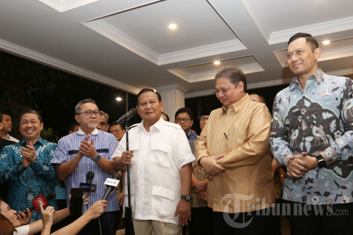 Ketua Umum Partai Gerindra Prabowo Subianto bersama sejumlah Ketua Umum dari Koalisi Indonesia Maju (KIM) memberikan keterangan kepada wartawan usai pertemuan tertutup di Kediaman Prabowo Subianto, Jakarta, Minggu (22/10/2023). Koalisi Indonesia maju resmi mengusung Prabowo Subianto sebagai Bakal Calon Presiden dan Gibran Rakbuming Raka sebagai Bakal Calon Wakil Presiden pada Pilpres 2024 mendatang. TRIBUNNEWS/IRWAN RISMAWAN