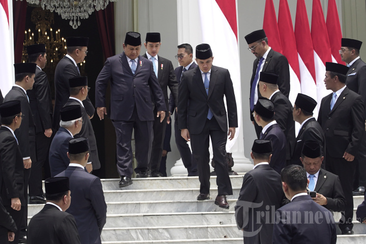 Presiden Prabowo Subianto didampingi Wakil Presiden Gibran Rakabuming Raka bersiap berfoto bersama Menteri Kabinet Merah Putih usai pelantikan di Istana Merdeka, Jakarta, Senin (21/10/2024). Presiden Prabowo Subianto resmi melantik ke-53 dan kepala badan negara setingkat menteri dalam Kabinet Merah Putih periode 2024-2029. TRIBUNNEWS/IRWAN RISMAWAN