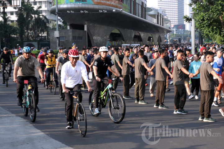 Presiden Joko Widodo bersepeda saat Hari Bebas Kendaraan Bermotor (HBKB) di kawasan Bundaran HI, Jakarta, Minggu (14/7/2024). Presiden Joko Widodo memanfaatkan kegiatan HBKB untuk berolahraga menggunakan sepeda serta menyapa masyarakat. TRIBUNNEWS/IRWAN RISMAWAN
