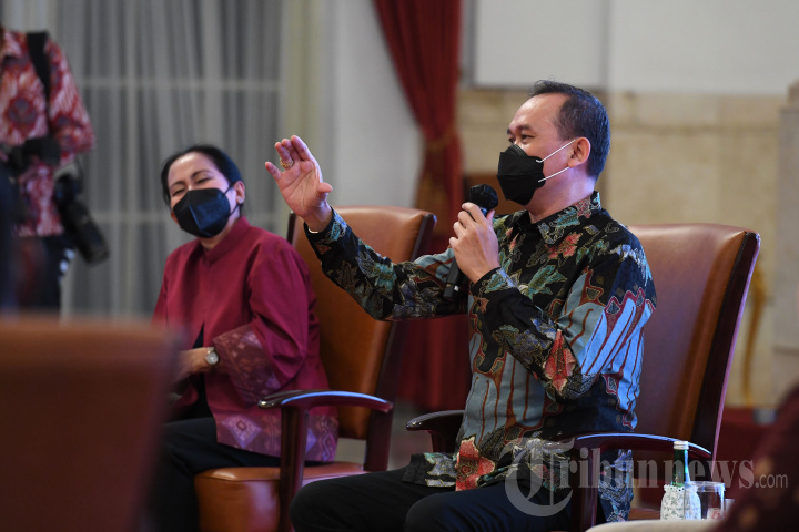 Komedian Lies Hartono atau yang lebih dikenal dengan nama Cak Lontong (kanan) berbicara saat menghadiri pertemuan para seniman dan budayawan dengan Presiden Joko Widodo di Istana Negara, Jakarta Pusat, Kamis (10/2/2022). Pada kesempatan tersebut, para seniman menyampaikan harapannya kepada Presiden Jokowi mengenai pelaksanaan kegiatan pertunjukan seni budaya di Tanah Air selama masa pandemi. Tribunnews/HO/Biro Pers Setpres/Lukas