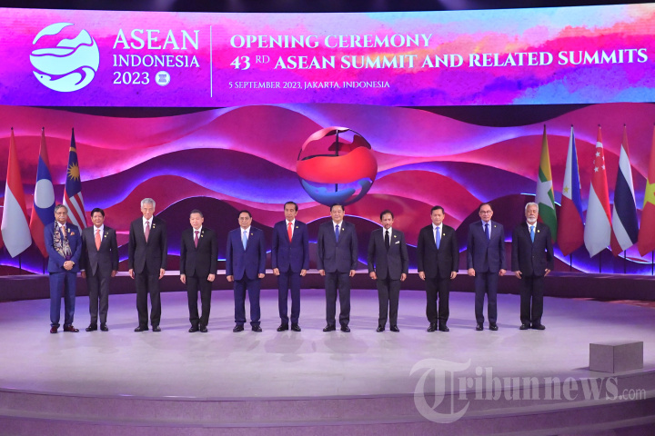 Presiden Joko Widodo (Jokowi) saat sesi foto bersama sejumlah kepala negara yang berpartisipasi dalam Konferensi Tingkat Tinggi (KTT) ke-43 ASEAN dan KTT lainnya, di Jakarta Convention Center, Selasa (5/9/2023). Indonesia memulai hari pertama keketuaan ASEAN dalam KTT ke-43 di Jakarta pada Selasa ini dan berlanjut hingga tanggal 7 September 2023 mendatang. Dalam perhelatan kali ini, tercatat sebanyak 22 negara akan hadir, terdiri atas 11 negara anggota ASEAN. ISTANA KEPRESIDENAN/AGUS SUPARTO