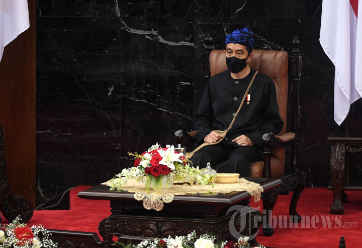 Presiden Joko Widodo menghadiri Sidang Tahunan MPR RI dan Sidang Bersama DPR RI dan DPD RI untuk menyampaikan pidato kenegaraan, di Kompleks Parlemen, Senayan, Jakarta Pusat, Senin (16/8/2021). Pidato Presiden Jokowi tersebut sekaligus dalam rangka HUT Ke-76 Kemerdekaan Republik Indonesia. Pada kesempatan itu, Presiden Jokowi mengenakan busana adat dari suku Baduy, Banten. Tribunnews/HO/Biro Pers Setpres/Lukas