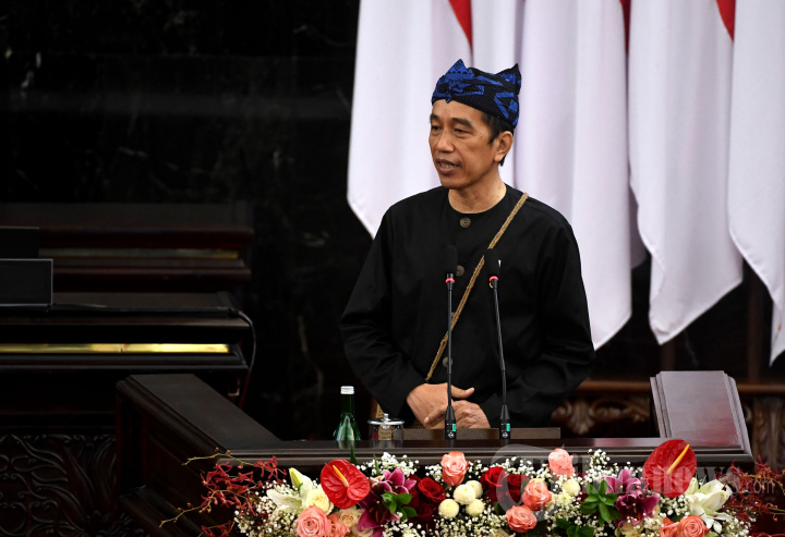 Presiden Joko Widodo menyampaikan pidato kenegaraan dalam Sidang Tahunan MPR RI dan Sidang Bersama DPR RI dan DPD RI, di Kompleks Parlemen, Senayan, Jakarta Pusat, Senin (16/8/2021). Pidato Presiden Jokowi tersebut sekaligus dalam rangka HUT Ke-76 Kemerdekaan Republik Indonesia. Pada kesempatan itu, Presiden Jokowi mengenakan busana adat dari suku Baduy, Banten. Tribunnews/HO/Biro Pers Setpres/Lukas