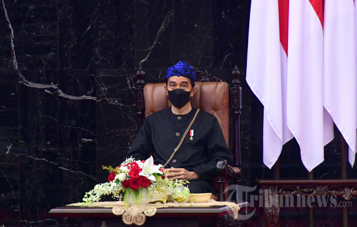 Presiden Joko Widodo menghadiri Sidang Tahunan MPR RI dan Sidang Bersama DPR RI dan DPD RI untuk menyampaikan pidato kenegaraan, di Kompleks Parlemen, Senayan, Jakarta Pusat, Senin (16/8/2021). Pidato Presiden Jokowi tersebut sekaligus dalam rangka HUT Ke-76 Kemerdekaan Republik Indonesia. Pada kesempatan itu, Presiden Jokowi mengenakan busana adat dari suku Baduy, Banten. Tribunnews/HO/Biro Pers Setpres/Muchlis Jr