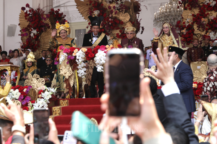 Presiden Joko Widodo (kedua kiri) selaku inspektur upacara didampingi Ibu Negara Iriana Joko Widodo (kiri), Wakil Presiden Ma'ruf Amin (kedua kanan) didampingi Wuri Estu Handayani (kanan) menyapa tamu undangan dalam Upacara Peringatan Detik-Detik Proklamasi Kemerdekaan ke-78 Republik Indonesia di Istana Merdeka, Jakarta, Kamis (17/8/2023). HUT ke-78 RI mengangkat tema Terus Melaju untuk Indonesia Maju. TRIBUNNEWS/IRWAN RISMAWAN