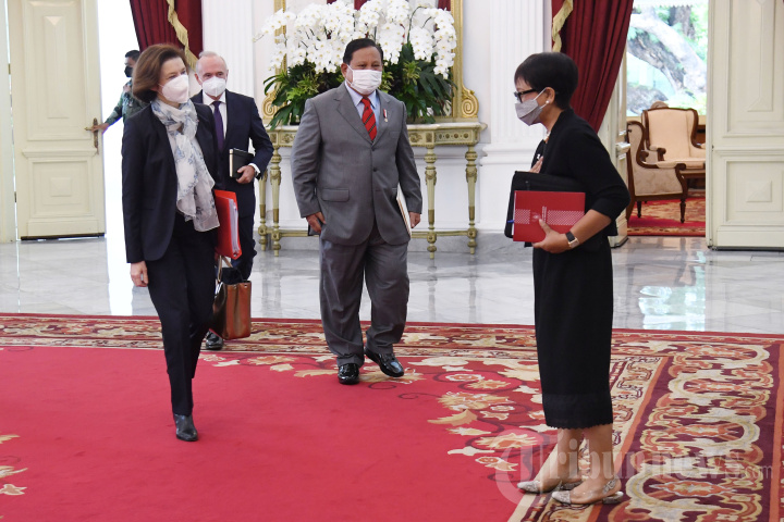 Menteri Luar Negeri Retno Marsudi dan Menteri Pertahanan Prabowo Subianto menemani Menteri Angkatan Bersenjata Prancis, Florence Parly untuk bertemu Presiden Joko Widodo, di Istana Merdeka, Jakarta, Kamis (10/2/2022). Pertemuan tersebut membahas kerja sama pertahanan kedua negara khususnya alat utama sistem persenjataan (alutsista). TRIBUNNEWS/BPMI/LUKAS