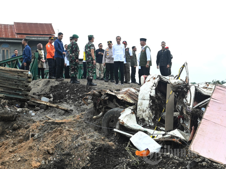 Presiden JokoWi beserta Ibu Iriana meninjau lokasi terdampak bencana longsor dan banjir bandang lahar dingin di Kabupaten Agam, Sumatra Barat, Selasa (21/5/2024). Presiden Jokowi didampingi Menteri Koordinator Bidang Pembangunan Manusia dan Kebudayaan Muhadjir Effendy, Kepala BNPB Suharyanto, Kepala Basarnas Kusworo, Gubernur Sumatra Barat Mahyeldi Ansharullah, dan Bupati Agam Andri Warman. Di area tersebut, Presiden Jokowi meninjau proses pembersihan puing yang tengah dilakukan para anggota TNI dari berbagai matra dan dari Basarnas. TRIBUNNEWS/BPMI SETPRES/KRIS
