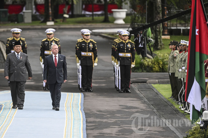KUNJUNGAN KENEGARAAN - Presiden Prabowo Subianto bersama Raja Kerajaan Yordania Hasyimiah Abdullah II Ibnu Al Hussein melakukan pemeriksaan pasukan dalam upacara kenegaraan di Istana Merdeka, Jakarta, Jumat (14/11/2025). Kunjungan Raja Yordania tersebut dalam rangka memperkuat hubungan bilateral dan kerja sama strategis antara Indonesia dan Yordania. Tribunnews/Jeprima