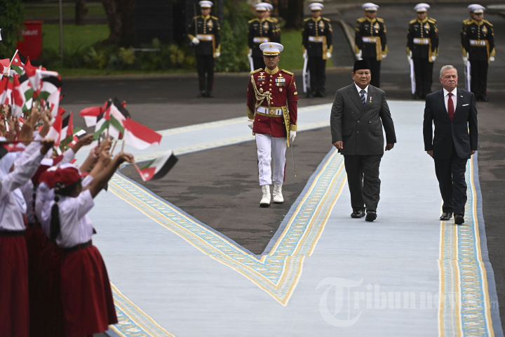 KUNJUNGAN KENEGARAAN - Presiden Prabowo Subianto bersama Raja Kerajaan Yordania Hasyimiah Abdullah II Ibnu Al Hussein melakukan pemeriksaan pasukan dalam upacara kenegaraan di Istana Merdeka, Jakarta, Jumat (14/11/2025). Kunjungan Raja Yordania tersebut dalam rangka memperkuat hubungan bilateral dan kerja sama strategis antara Indonesia dan Yordania. Tribunnews/Jeprima