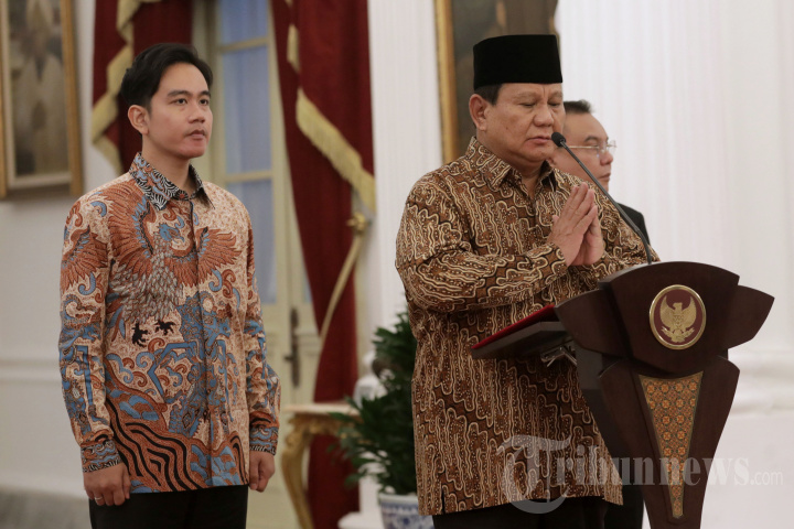Presiden Prabowo Subianto didampingi Wakil Presiden Gibran Rakabuming Raka memberikan keterangan terkait Menteri Kabinet Merah Putih di Istana Merdeka, Jakarta, Minggu (20/10/2024). Usai dilantik, Presiden Prabowo Subianto dan Wakil Presiden Gibran Rakabuming Raka mengumumkan nama kabinetnya yakni Kabinet Merah Putih dengan diisi 53 Menteri dan 56 Wakil Menteri. TRIBUNNEWS/IRWAN RISMAWAN