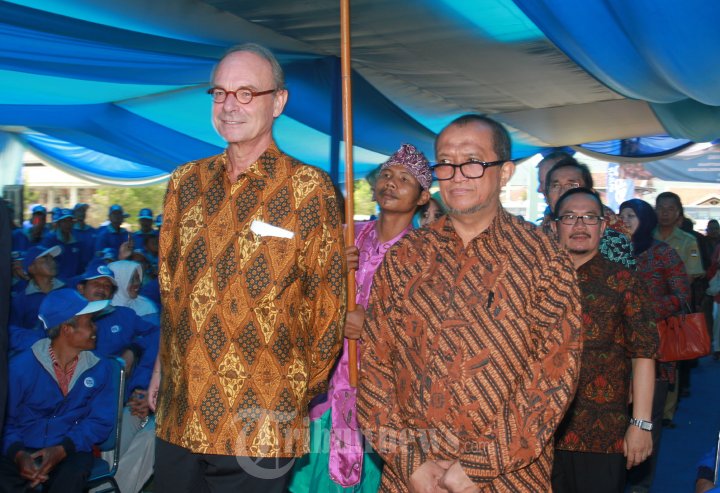 PROGRAM KEMITRAAN - Presdir Frisian Flag Indonesia, Marco Spits didampingi, Direktur Kesehatan Masyarakat Veteriner dan Pasca Panen Ditjen Peternakan dan Kesehatan Kementerian Pertanian RI, Akhmad Junaidi, memasuki acara peluncuran program kemitraan peternakan sapi perah di Desa Cibodas, Kecamatan Lembang, Kabupaten Bandung Barat, Rabu (3/7/2013). Program kemitraan kurun waktu 2013-2017 dengan total dana 10 Juta Euro (Rp 130 Miliar), yang berasal dari pemerintah Belanda sebesar 4 Juta Euro (Rp 52 Miliar), dari FFI dan koperasi sebesar 6 Juta Euro (Rp 78 Miliar), program ini bertujuan untuk meningkatkan kesejahteraan lebih dari 10 ribu peternak sapi perah si Pangalengan dan Lembang. (Warta Kota/nur ichsan)