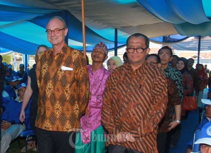 PROGRAM KEMITRAAN---- Presdir Frisian Flag Indonesia, Marco Spits didampingi, Direktur Kesehatan Masyarakat Veteriner dan Pasca Panen Ditjen Peternakan dan Kesehatan Kementerian Pertanian RI, Akhmad Junaidi, memasuki acara peluncuran program kemitraan peternakan sapi perah di Desa Cibodas, Kecamatan Lembang, Kabupaten Bandung Barat, Rabu (3/7/2013). Program kemitraan kurun waktu 2013-2017 dengan total dana 10 Juta Euro (Rp 130 Miliar), yang berasal dari pemerintah Belanda sebesar 4 Juta Euro (Rp 52 Miliar), dari FFI dan koperasi sebesar 6 Juta Euro (Rp 78 Miliar), program ini bertujuan untuk meningkatkan kesejahteraan lebih dari 10 ribu peternak sapi perah si Pangalengan dan Lembang.