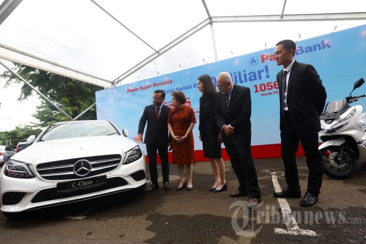 President Director PaninBank Herwidayatmo (kanan), Deputy President Director Roosniati Salihin (tengah) dan Head of Business Development Elissa Putri Gunawan (kedua kanan), dan Chief Operation Officer Tunas Honda Gusti Prasetiawan (kedua kiri) melihat hadiah utama mobil didampingi Deputy Director Sales Operation & Product Management Mercedes-Benz Distribution Indonesia Kariyanto Hardjosoemarto, pada pengumuman penyelenggaraan program Panin Super Bonanza 2019, di Jakarta, Selasa (5/3/2019). Program yang setiap tahun dirancang secara inovatif dengan nilai hadiah yang terus ditingkatkan tersebut terbukti telah mendukung penghimpunan dana ritel hampir 40 persen atau sekitar Rp50 triliun. TRIBUNNEWS/IRWAN RISMAWAN