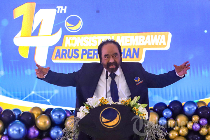 HUT NASDEM - Ketua Umum Partai Nasdem Surya Paloh menyampaikan pidato pada puncak perayaan HUT ke-14 Partai Nasdem di Jakarta, Selasa (11/11/2025). Perayaan HUT ke-14 Partai Nasdem mengusung tema Konsisten Membawa Arus Perubahan. TRIBUNNEWS/IRWAN RISMAWAN